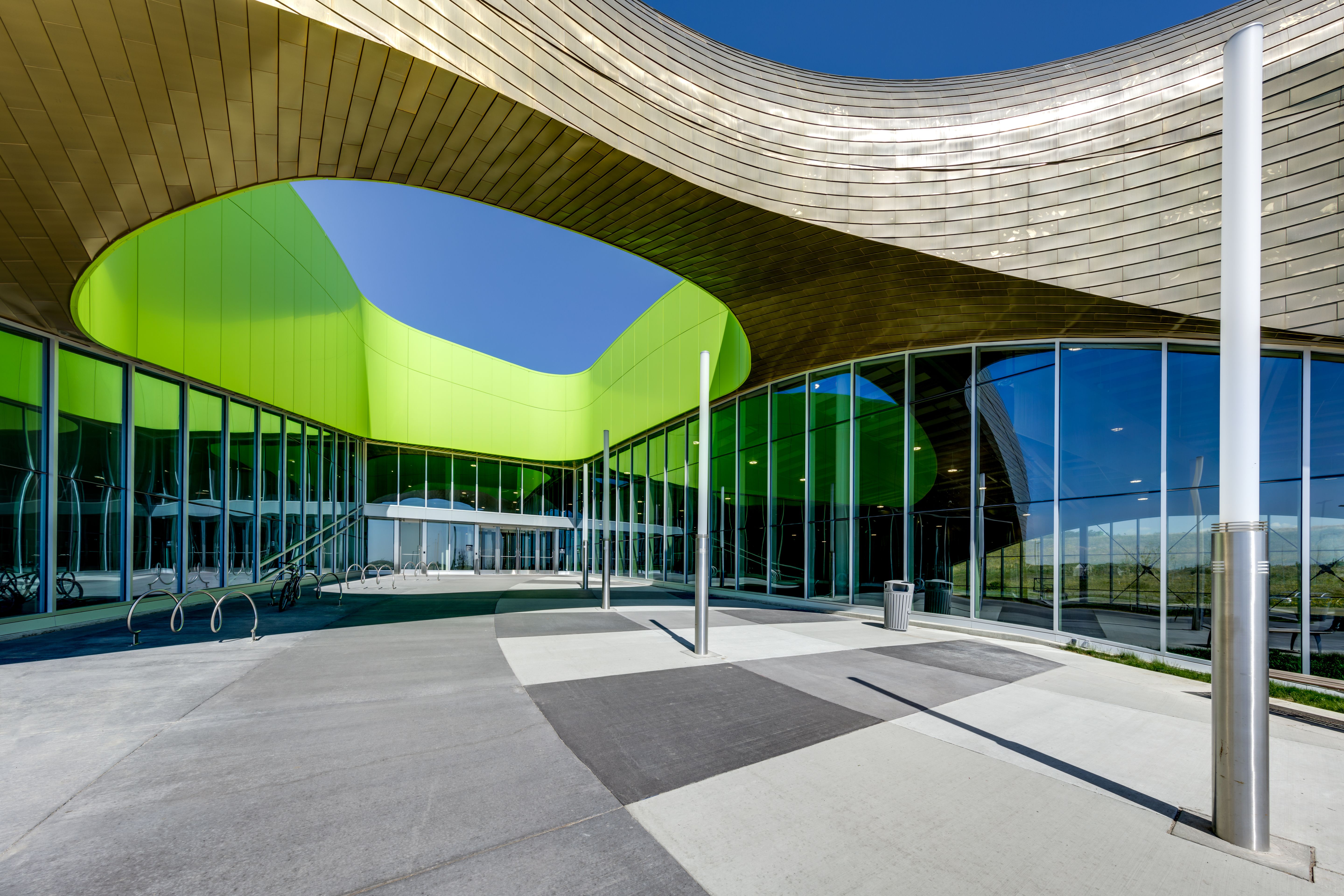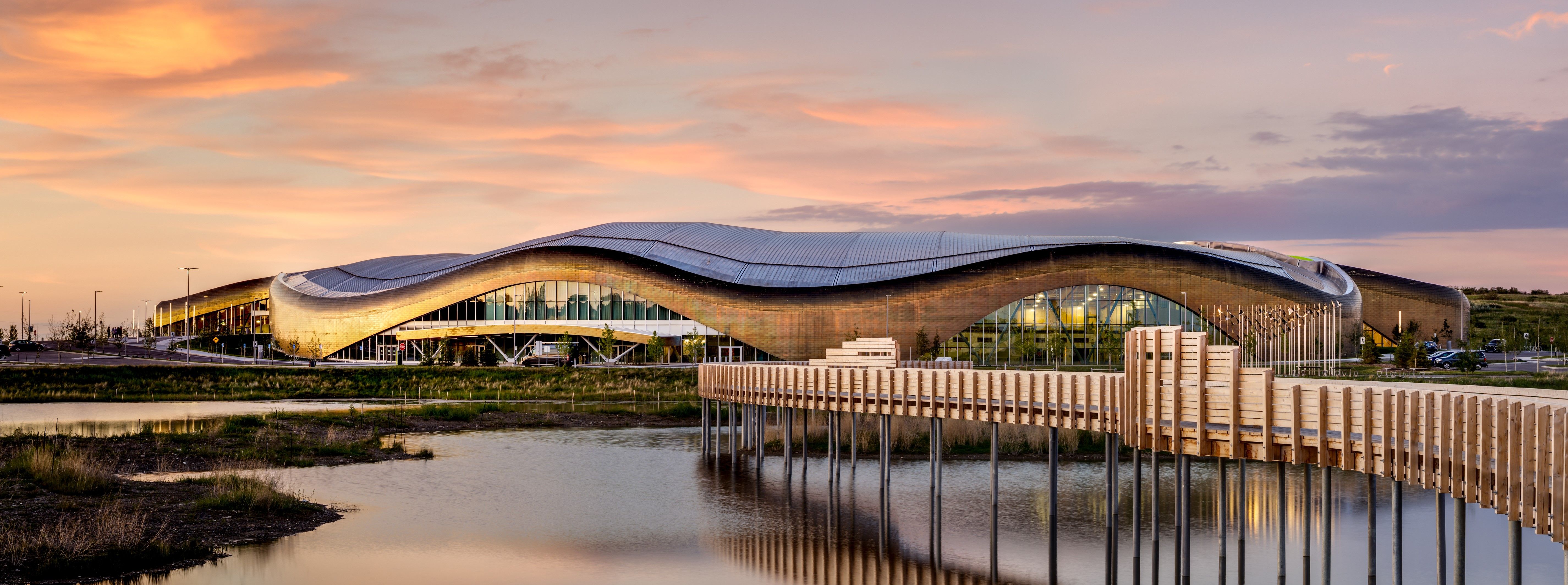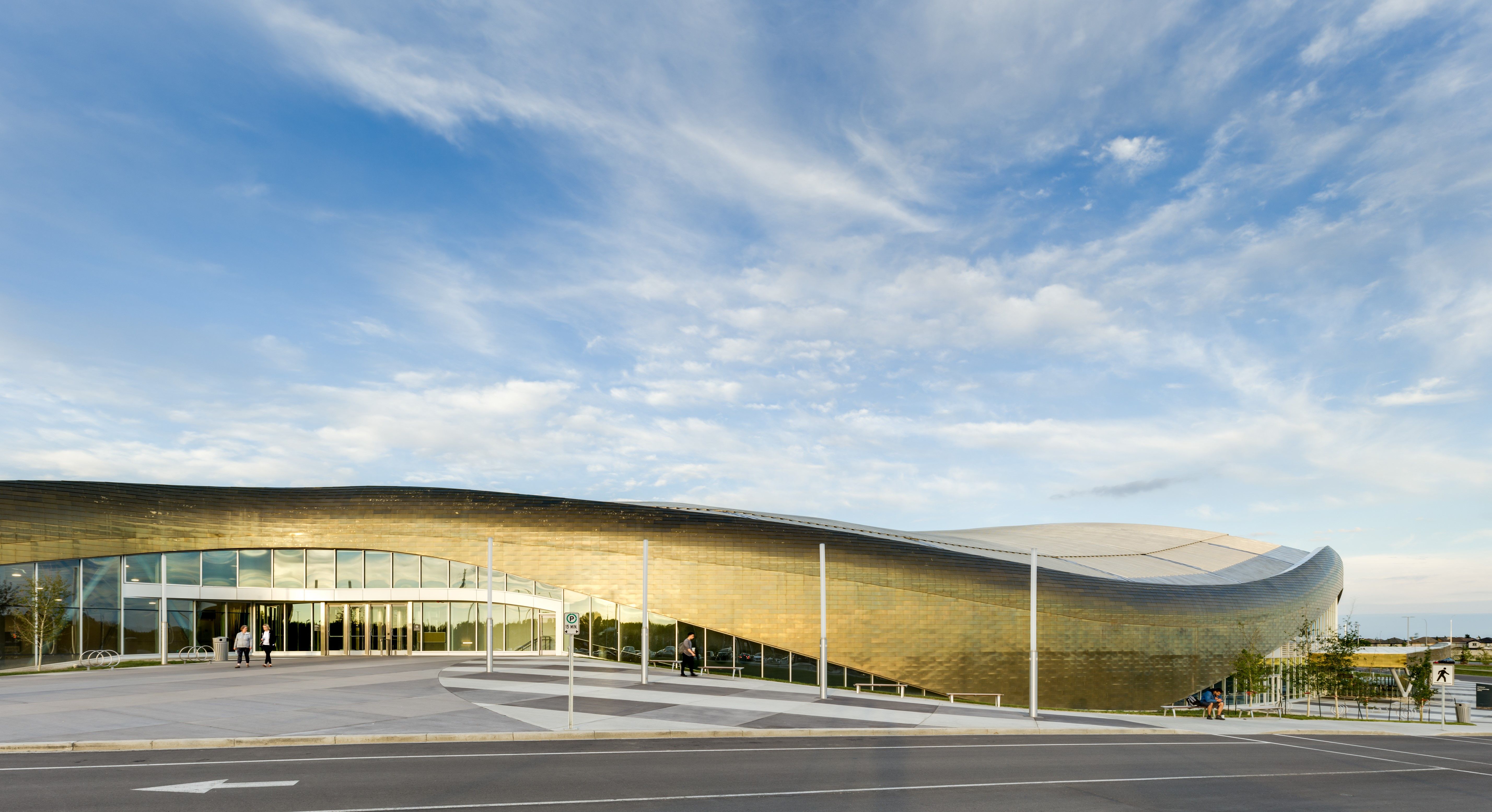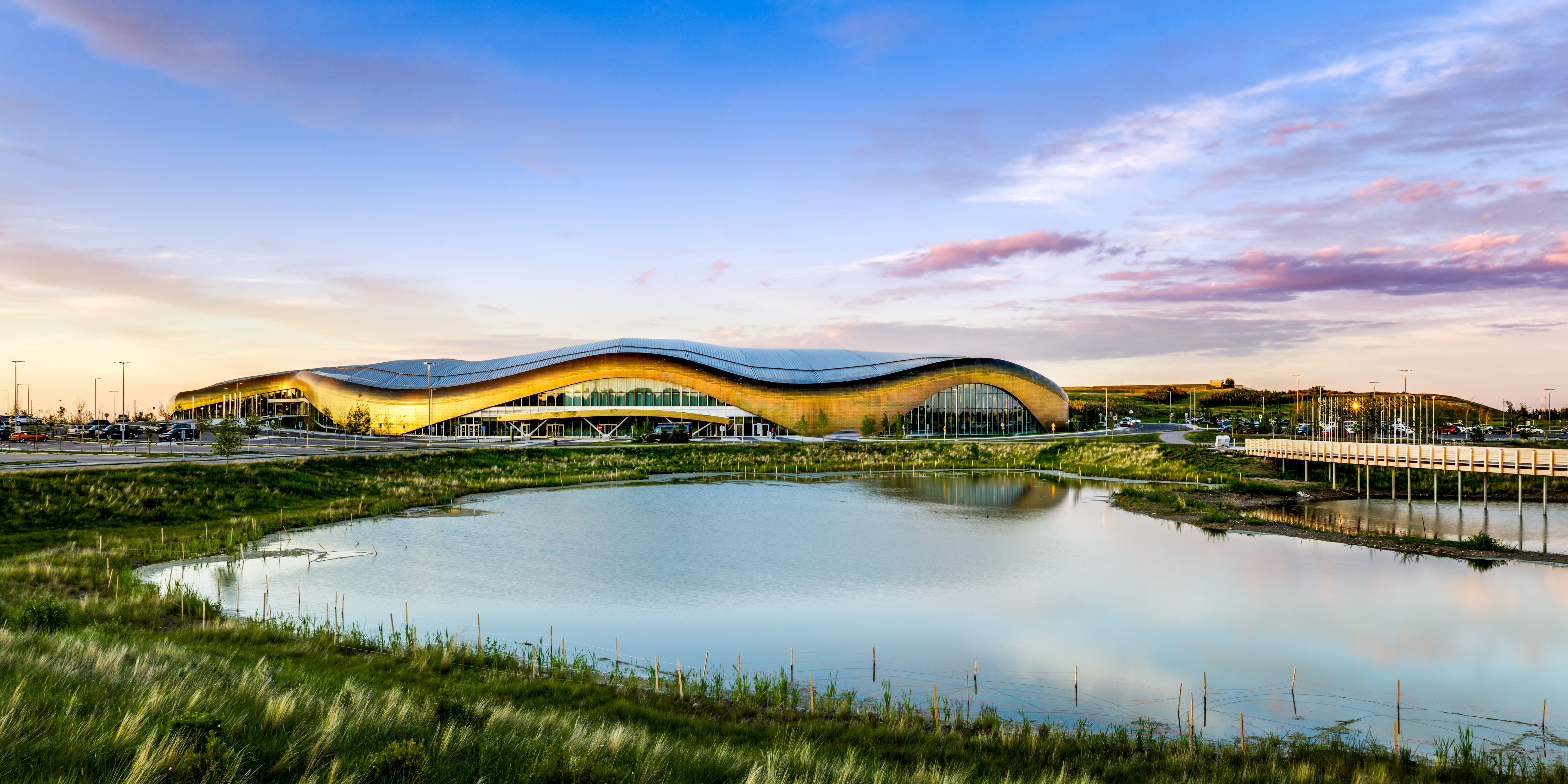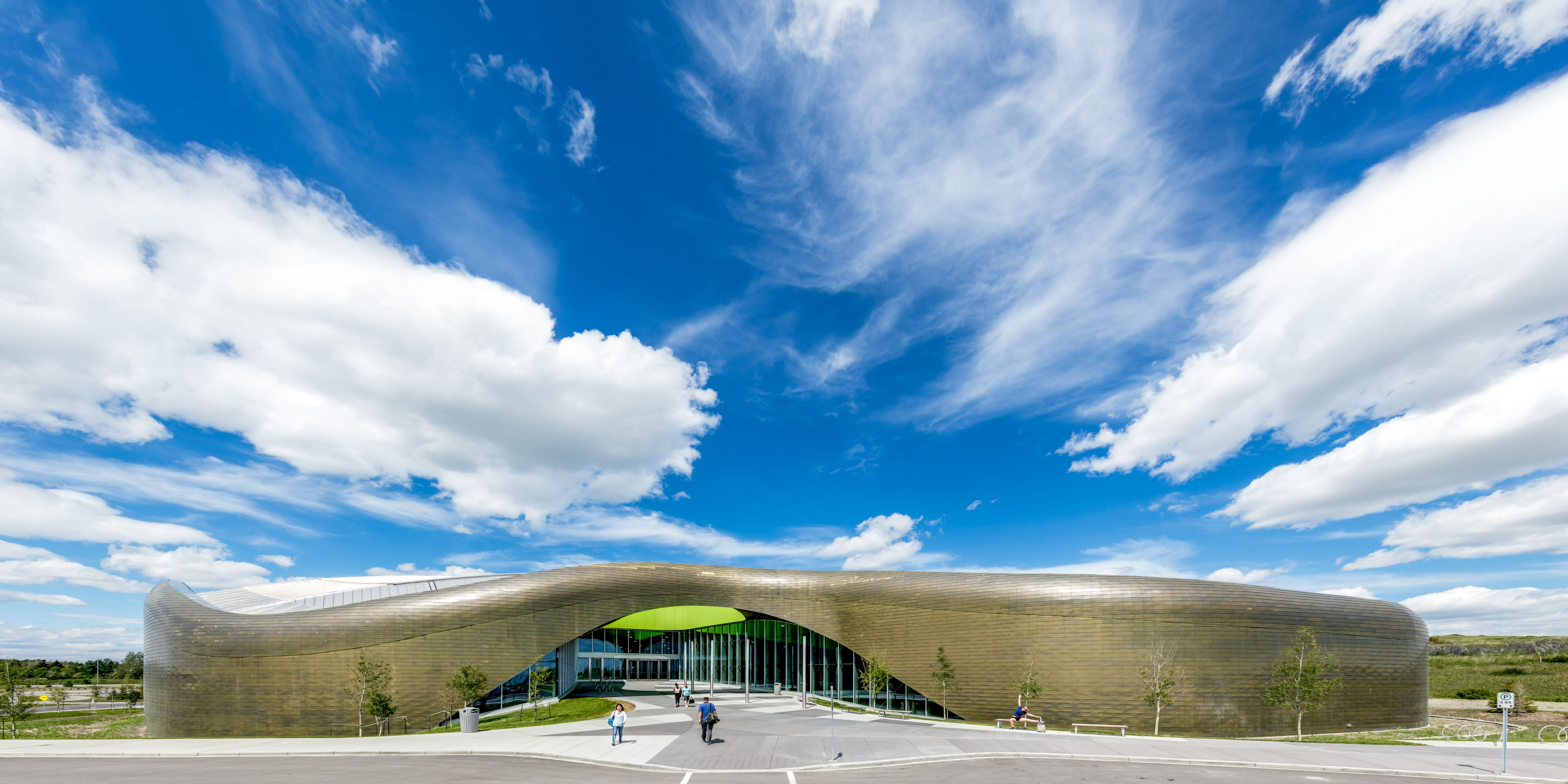 The Rocky Ridge Recreation Facility is located atop the tallest natural elevation hill in Calgary, boasting spectacular views of the Rocky Mountains and the City of Calgary from within. Designed to complement the surrounding landscape, the facility is considered “a building within a park” and the reflective exterior cladding changes colour with the seasons. Built on a reconstructed wetland, the facility encourages outdoor activities through various pathways and trails that connect to archaeological sites, wetlands, and regional pathway systems.